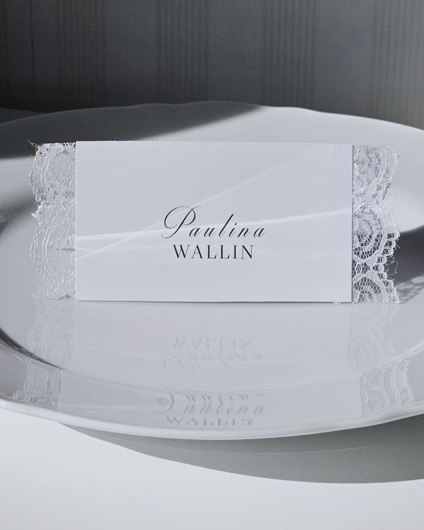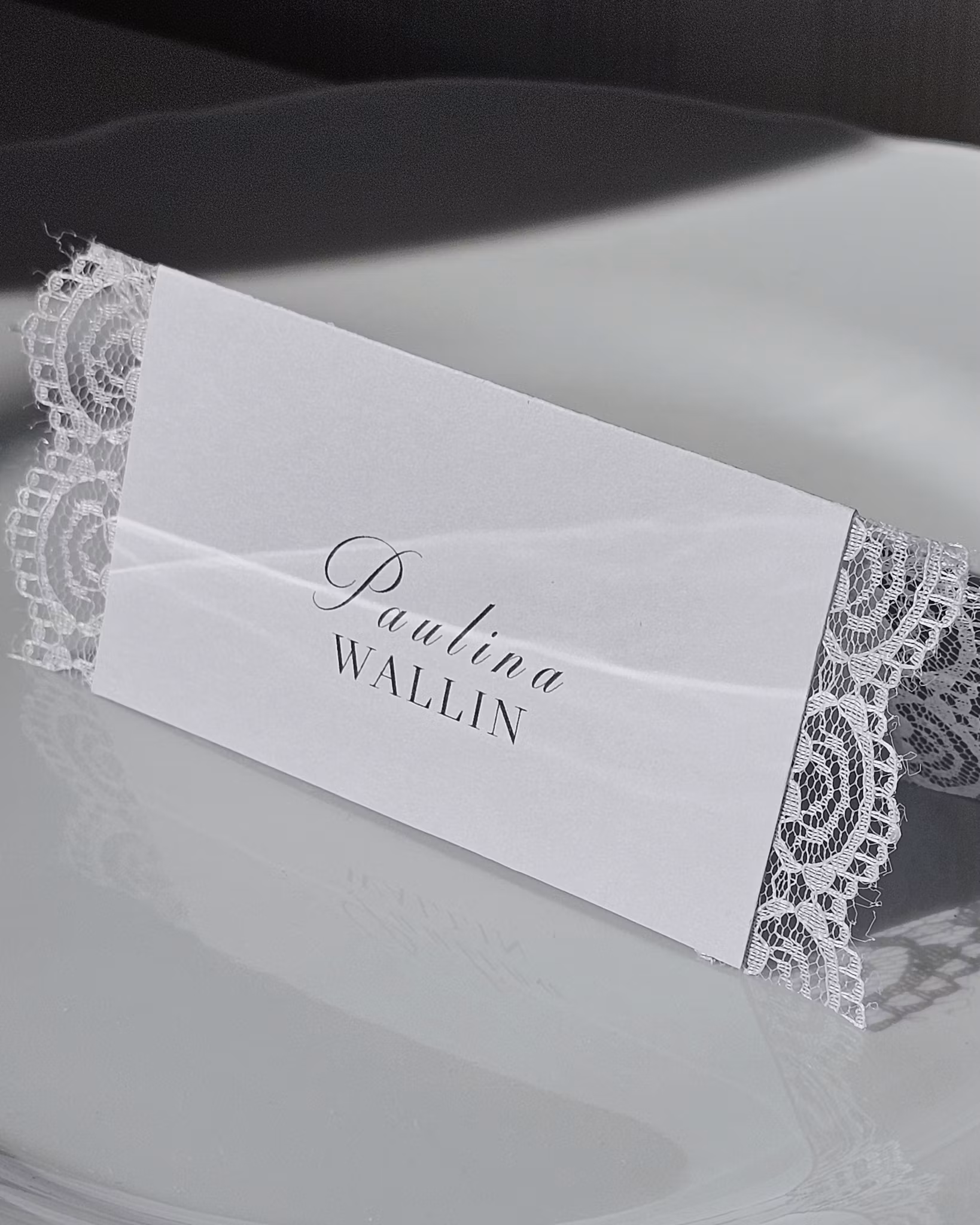 Det vita kortet är tryckt på matt papper med svart text för ett stilrent och exklusivt uttryck. Den dekorativa spetskanten ramar in kortet och ger en romantisk, mjuk känsla som passar perfekt till bröllop och andra festliga tillfällen.