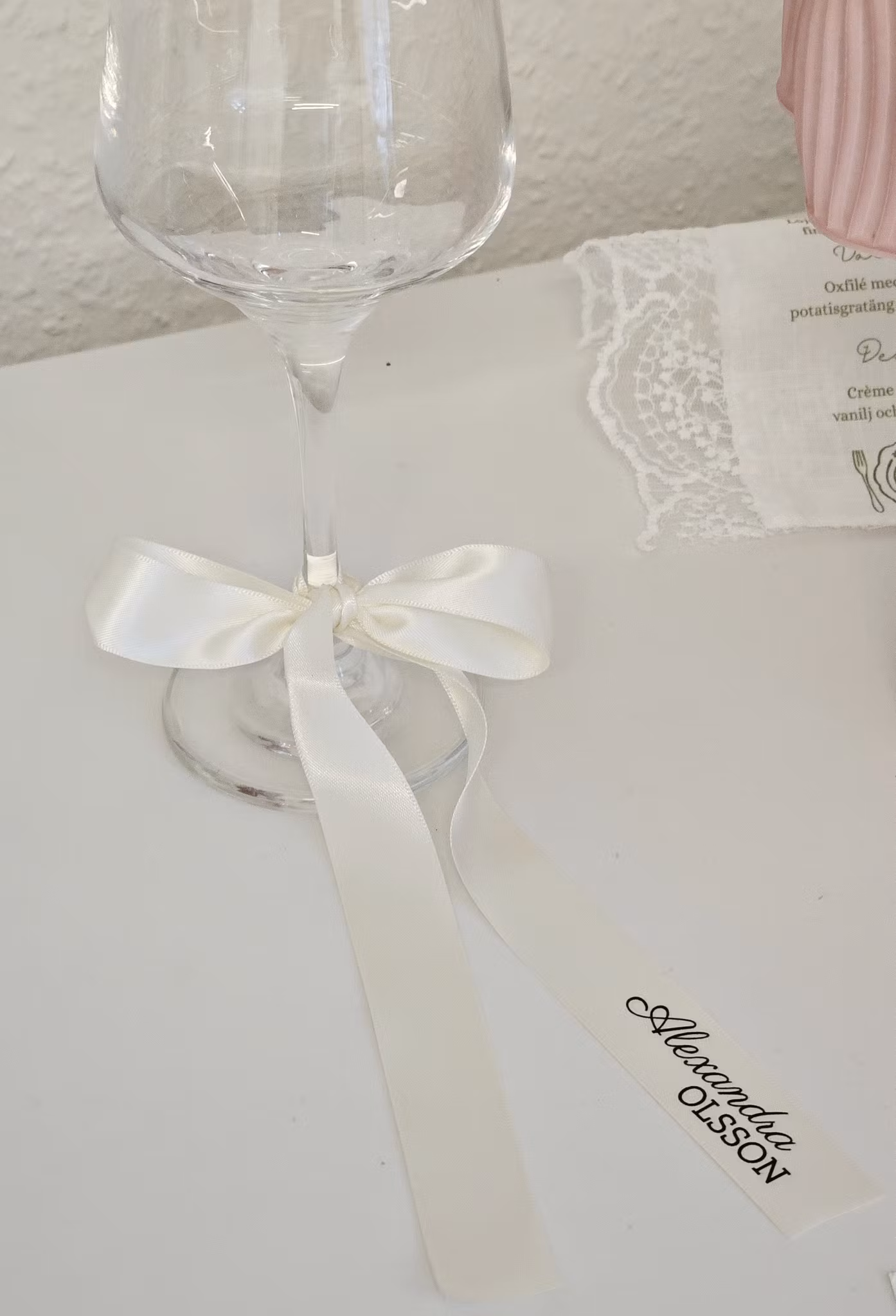 Våra gräddvita satinband trycks med namn i valfri färg för att matcha ert tema. Ni kan välja mellan flera stilrena fonter – eller skicka in er egen för att hålla en röd tråd genom era trycksaker. Vill ni addera ett monogram eller en ikon? Det går självklart också!