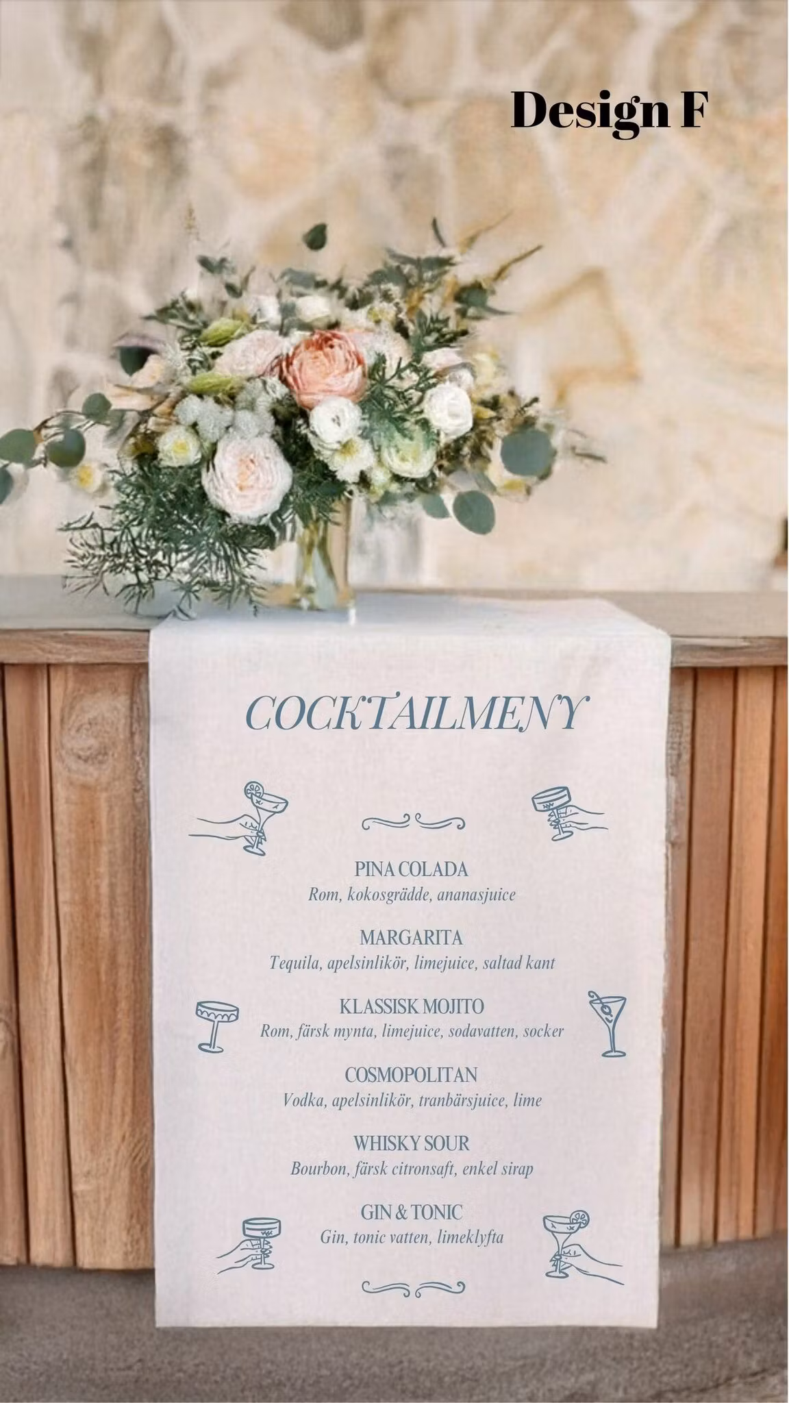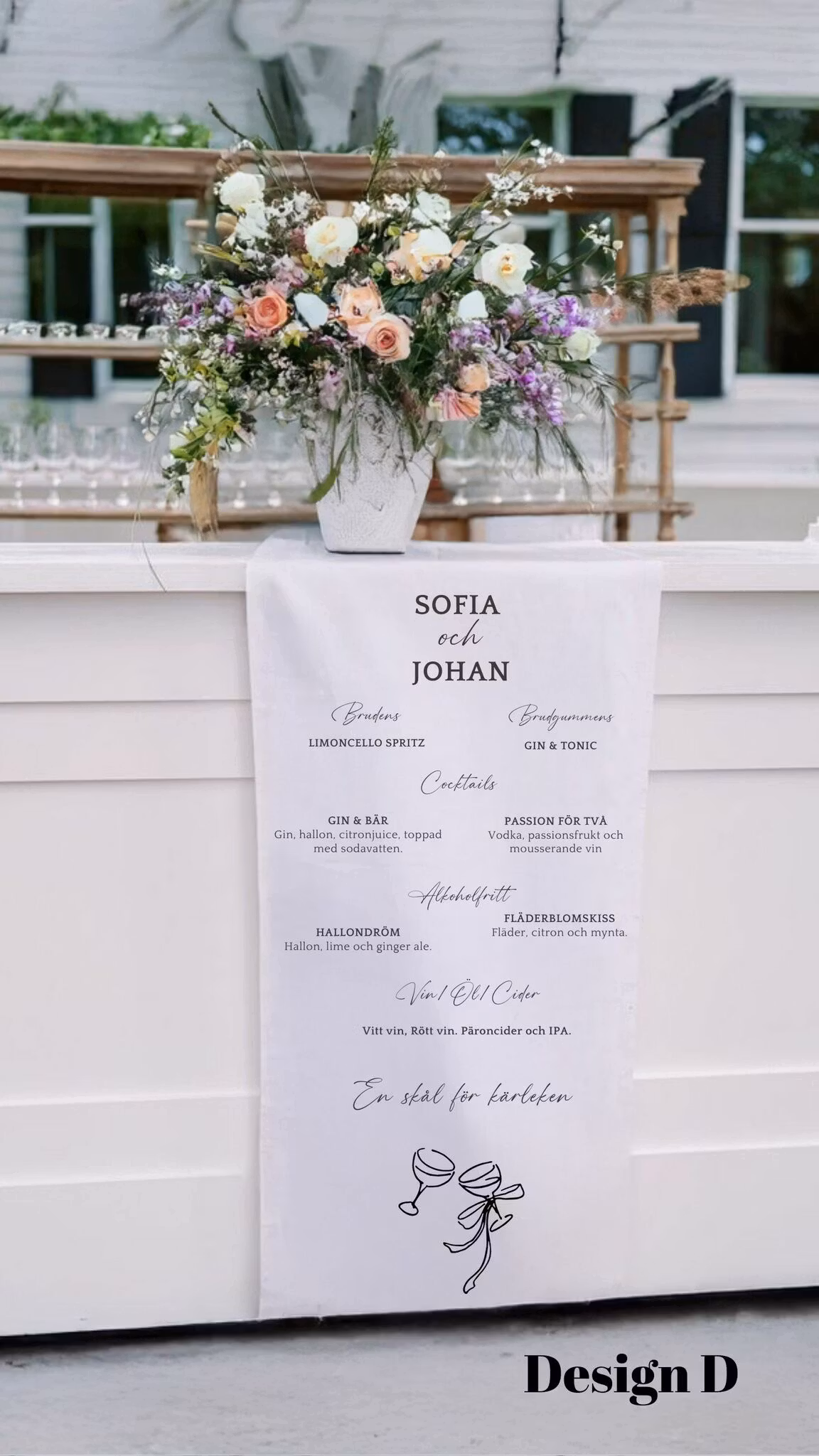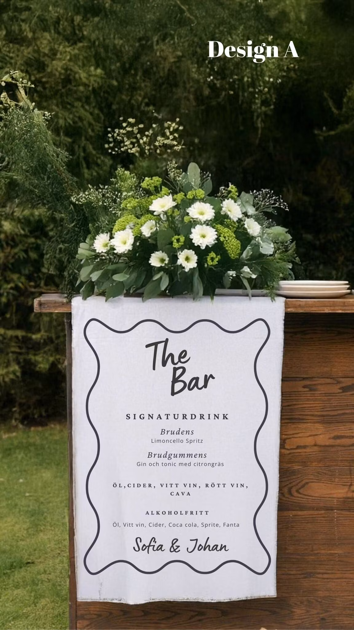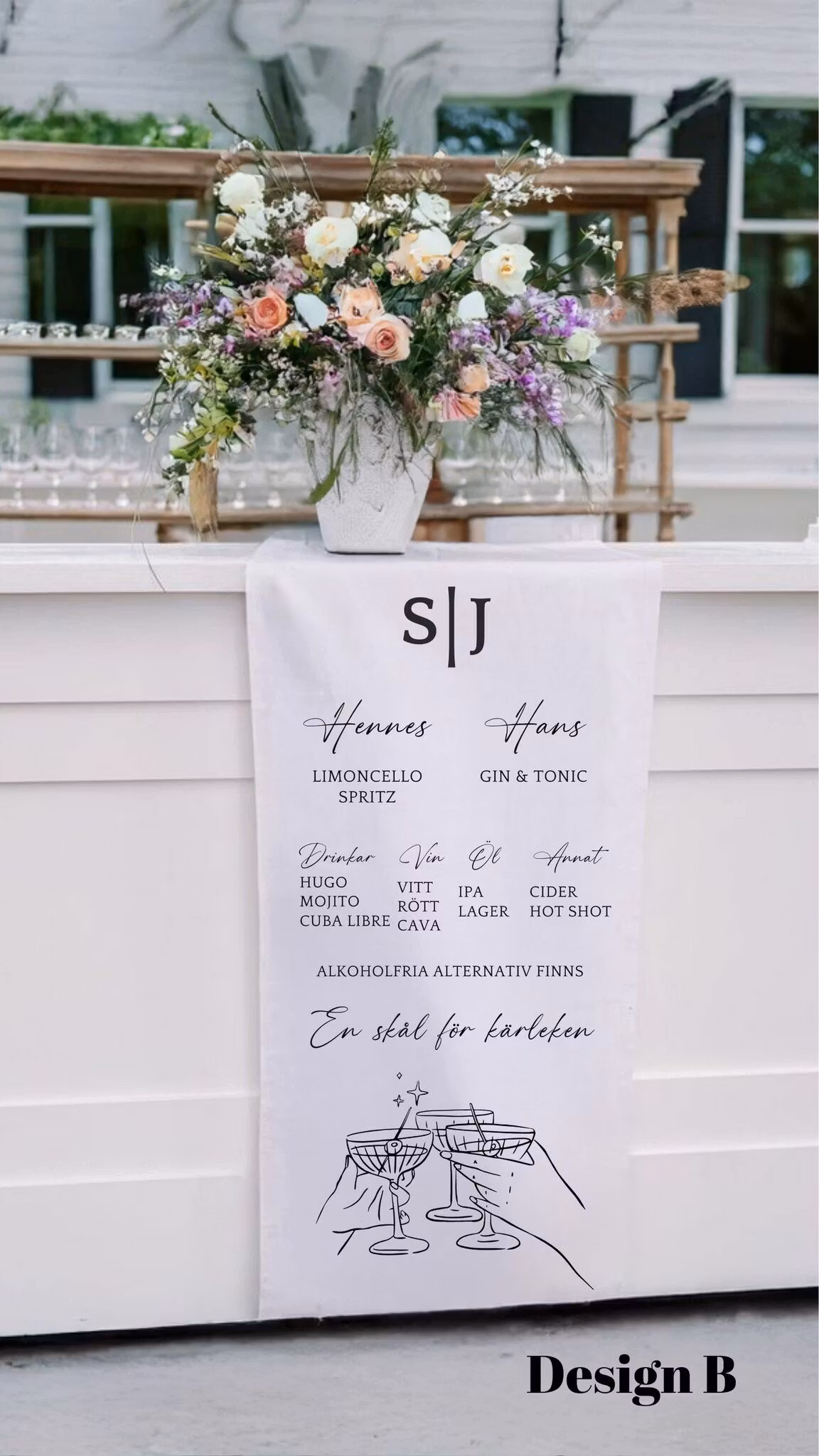 För att passa just ert tema erbjuder vi sex olika designer – var och en med sin egen charm och stil. Ni väljer enkelt den design som bäst speglar er vision och fyller i detaljer om ert drinkutbud för att skapa en skylt som är lika unik som ert event.