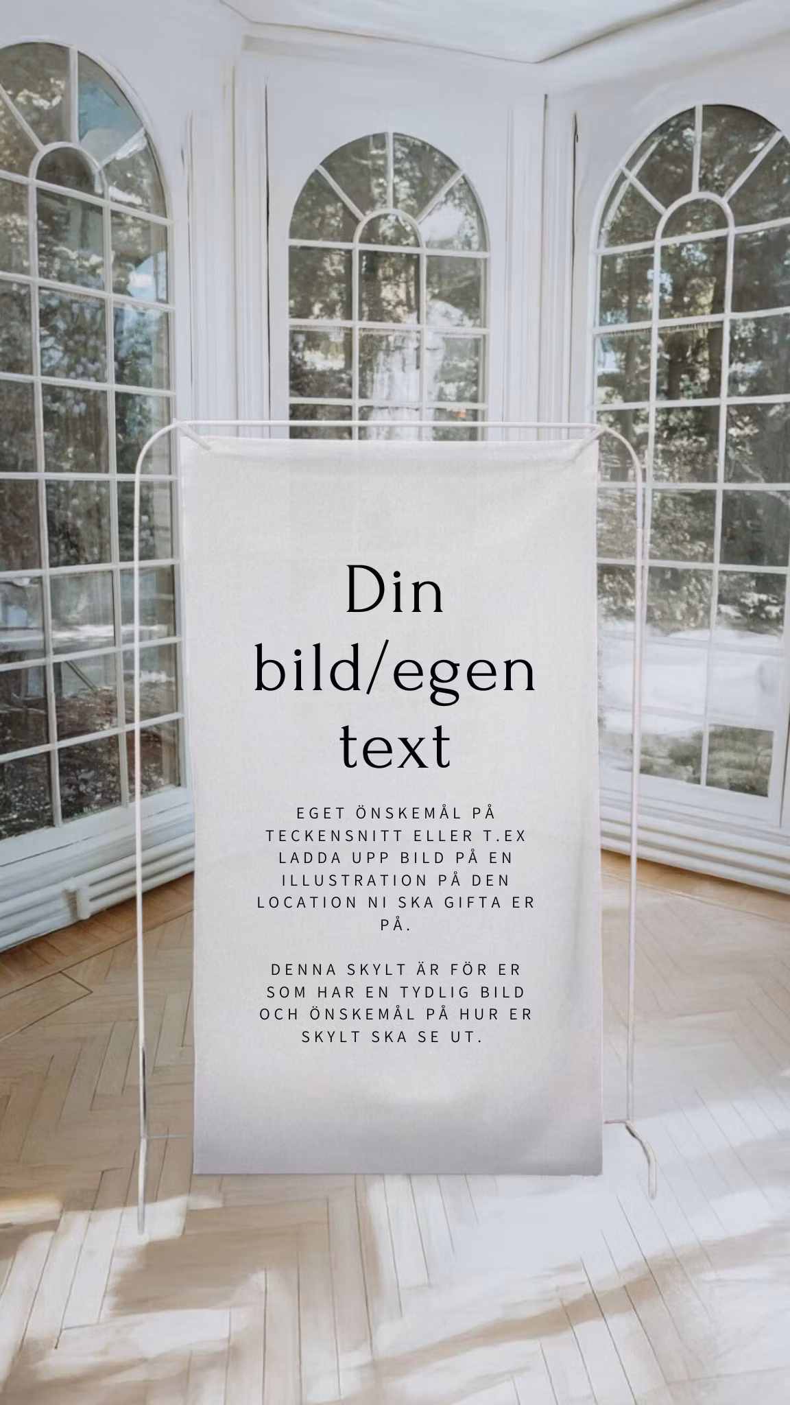 Med en kreativ och skräddarsydd design kan ni välja mellan två storlekar: 50 x 150 cm eller 80 x 145 cm. Ni kan också välja att ladda upp en egen bild och skapa en skylt som är helt unik för er speciella dag. Dessutom kan ni anpassa texten på skylten och välja färger på texten för att matcha ert färgtema. Har ni en exakt färgkod (t.ex. HEX)? Inkludera gärna den för en perfekt matchning med er design!